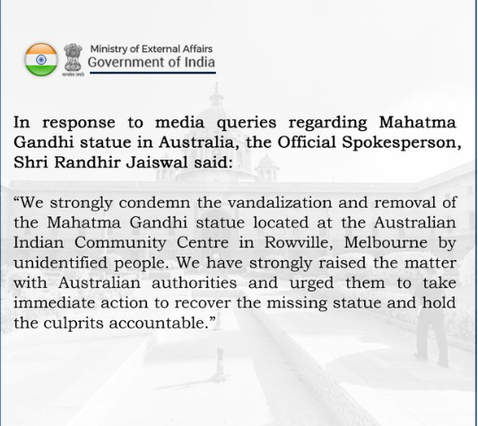 অস্ট্রেলিয়ার মেলবোর্নে আবারও ভাঙচুরের শিকার হল মহাত্মা গান্ধীর মূর্তি। দুষ্কৃতীরা মূর্তিটির পা কেটে নিয়ে পালিয়েছে বলে জানা গিয়েছে। ঘটনাকে কেন্দ্র করে ব্যাপক চাঞ্চল্য ছড়িয়েছে অস্ট্রেলিয়ায় বসবাস করা ভারতীয়দের মধ্যে। ভারতের তরফে এই ঘটনার তীব্র নিন্দা জানিয়ে দ্রুত ব্যবস্থা নেওয়ার আবেদন করা হয়েছে অস্ট্রেলীয় প্রশাসনের কাছে। মঙ্গলবার বিদেশ মন্ত্রকের মুখপাত্র রণধীর জয়সওয়াল সমাজমাধ্যমে একটি পোস্টে বিবৃতি দিয়ে বলেন, “মেলবোর্নে মহাত্মা গান্ধীর মূর্তি ভাঙার ঘটনার তীব্র নিন্দা জানাচ্ছে ভারত। বিষয়টি অস্ট্রেলীয় কর্তৃপক্ষের নজরে আনা হয়েছে। দ্রুত পদক্ষেপ করে মূর্তি উদ্ধার ও দোষীদের বিরুদ্ধে উপযুক্ত ব্যবস্থা নেওয়ার আবেদন জানানো হয়েছে।”