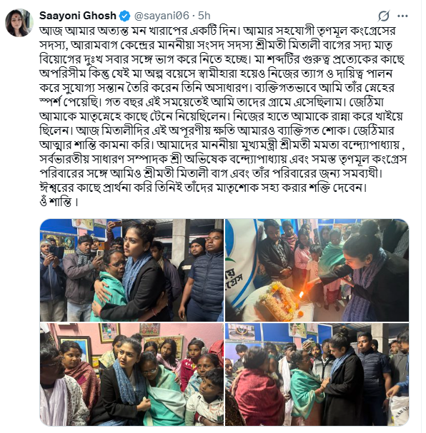 কিছুদিন আগেই মাতৃহারা হয়েছেন আরামবাগের তৃণমূল সাংসদ মিতালী বাগ (Mitali Bag)। এই পরিস্থিতিতে সমবেদনা জানাতে সাংসদের বাড়ি পৌঁছেছিলেন যাদবপুর লোকসভা কেন্দ্রের সাংসদ সায়নী ঘোষ। সেখানে গিয়ে পুরনো দিনের কথা ভেবে স্মৃতিতে ডুব দিয়ে আবেগপ্রবণ হয়ে পড়েন যাদবপুরের তারকা সাংসদ সায়নী ঘোষ (Sayani Ghosh)। তিনি নিজের X হ্যান্ডেলে সেই মুহূর্তের ছবিও শেয়ার করেন। সোশ্যাল মিডিয়ায় সাংসদ সায়নী লেখেন, “আজ আমার অত্যন্ত মন খারাপের একটি দিন। আমার সহযোগী তৃণমূল কংগ্রেসের সদস্য, আরামবাগ কেন্দ্রের মাননীয়া সংসদ সদস্য শ্রীমতী মিতালী বাগের সদ্য মাতৃ বিয়োগের দুঃখ সবার সঙ্গে ভাগ করে নিতে হচ্ছে। মা শব্দটির গুরুত্ব প্রত্যেকের কাছে অপরিসীম কিন্তু যেই মা অল্প বয়েসে স্বামীহারা হয়েও নিজের ত্যাগ ও দায়িত্ব পালন করে সুযোগ্য সন্তান তৈরি করেন তিনি অসাধারণ।”