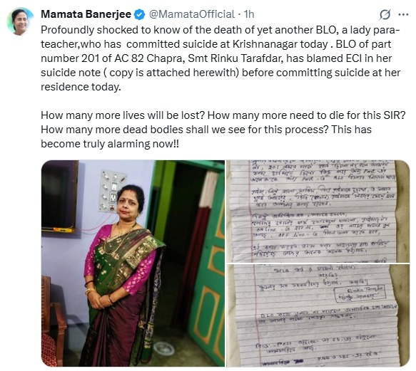 SIR আতঙ্কে ফের এক মহিলার অস্বাভাবিক মৃত্যু। এ বার নদিয়ার কৃষ্ণনগরে আত্মঘাতী হলেন এক বুথ লেভেল অফিসার (বিএলও)। মৃত ওই বিএলও-র নাম রিঙ্কু তরফদার (৫১)। তিনি চাপ়়া বাঙালঝি স্বামী বিবেকানন্দ বিদ্যামন্দিরের পার্শ্বশিক্ষক ছিলেন। শনিবার সকালে বাড়ি থেকে তাঁর দেহ উদ্ধার করা হয়। পুলিশ সূত্রে খবর, ওই ঘর থেকে একটি সুইসাইড নোট উদ্ধার করা হয়েছে। সেখানে নিজের মৃত্যুর জন্য নির্বাচন কমিশনকে দায়ী করেছেন তিনি। কাজের অত্যাধিক চাপ সহ্য করতে না পেরে বাধ্য হয়ে এমন চরম সিদ্ধান্ত বলে ওই সুইসাইড নোটে লিখে রেখেছেন তিনি। এই নিয়ে সমাজ মাধ্যমে সরব হয়েছেন মুখ্যমন্ত্রী। মৃত বিএলও’র ছবি ও চিঠি পোস্ট করে মমতা বন্দ্যোপাধ্যায় প্রশ্ন তুলেছেন,”আর কত মানুষের প্রাণ যাবে? SIR এর জন্য আর কতজনকে মরতে হবে? এই প্রক্রিয়ায় আর কত শবদেহ আমরা দেখব?”