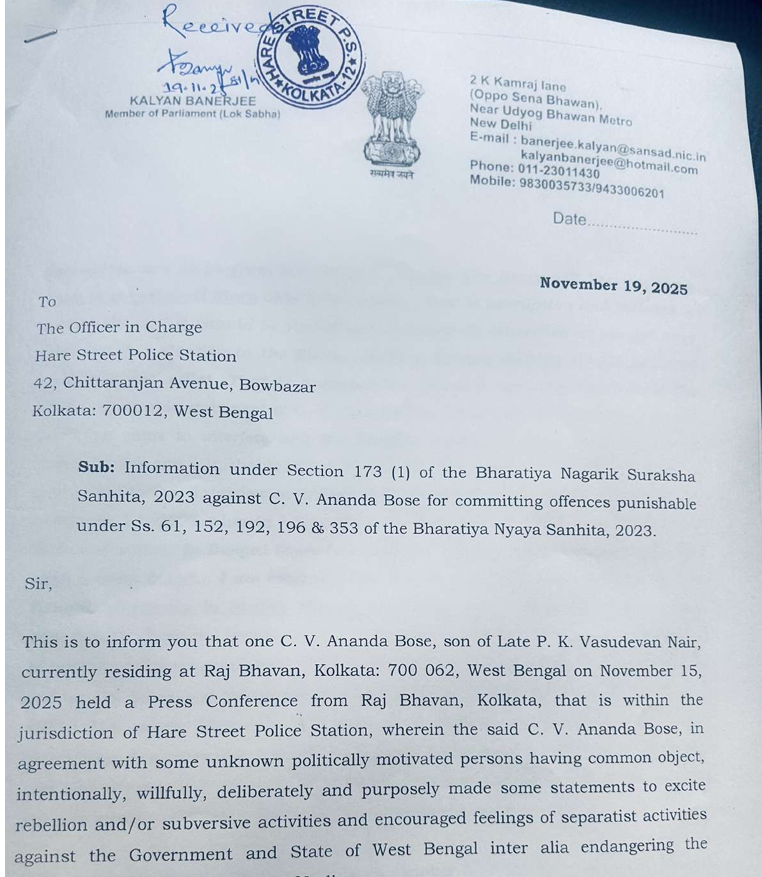 বুধবার হেয়ার স্ট্রিট থানায় শাস্তিযোগ্য অপরাধে ভারতীয় নাগরিক সুরক্ষা সংহিতা, ২০২৩-এর ধারা ১৭৩(১-)-এর অধীনে আনন্দ বোসের বিরুদ্ধে চিঠি দেন সাংসদ কল্যাণ বন্দ্যোপাধ্যায় । চিঠিতে তিনি ভারতীয় ন্যায় সংহিতা, ২০২৩-এর ৬১, ১৫২, ১৯২, ১৯৬ ও ৩৫৩- এর উল্লেখ করেন। সেখানে প্রয়াত পি কে বাসুদেবন নায়ারের পুত্র সি ভি আনন্দ বোসের বিরুদ্ধে রাজভবন থেকে সাংবাদিক বৈঠক করে রাজনৈতিক উদ্দেশ্য প্রণোদিতভাবে ইচ্ছাকৃতভাবে, উদ্দেশ্যমূলকভাবে বিদ্রোহ ও ধ্বংসাত্মক কার্যকলাপকে উত্তেজিত করার জন্য কিছু বিবৃতি দিয়েছিলেন বলে অভিযোগ করেন কল্যাণ। তিনি চিঠিতে দাবি করেছেন, পশ্চিমবঙ্গ সরকার এবং রাজ্যের বিরুদ্ধে বিচ্ছিন্নতাবাদী কার্যকলাপের উস্কানি দিয়েছেন আনন্দ বোস যা ভারতের সার্বভৌমত্ব, ঐক্য এবং অখণ্ডতাকে বিপন্ন করে।