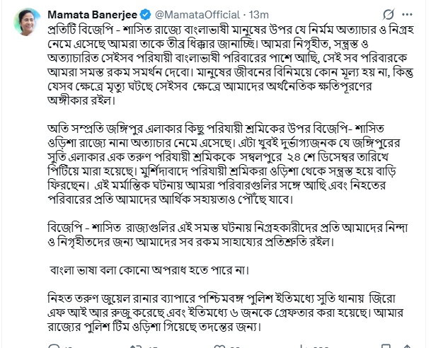বিজেপি – শাসিত রাজ্যগুলির এই সমস্ত ঘটনায় নিগ্রহকারীদের প্রতি আমাদের নিন্দা ও নিগৃহীতদের জন্য আমাদের সব রকম সাহায্যের প্রতিশ্রুতি রইল। বাংলা ভাষা বলা কোনো অপরাধ হতে পারে না। নিহত তরুণ জুয়েল রানার ব্যাপারে পশ্চিমবঙ্গ পুলিশ ইতিমধ্যে সুতি থানায় জিরো এফ আই আর রুজু করেছে এবং ইতিমধ্যে ৬ জনকে গ্রেফতার করা হয়েছে। আমার রাজ্যের পুলিশ টিম ওড়িশা গিয়েছে তদন্তের জন্য।’