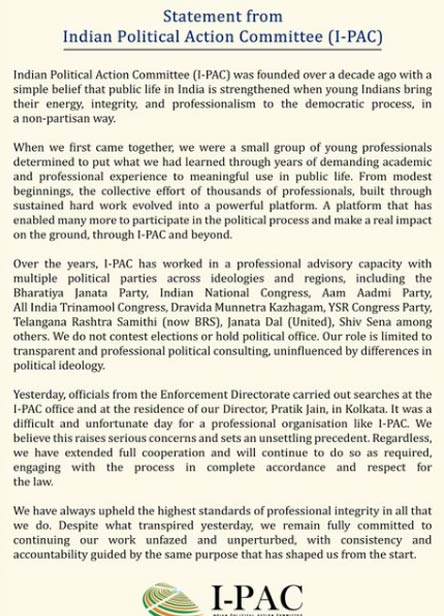 এদিকে ইডির অভিযানের পর শুক্রবারই প্রথম মুখ খোলেন প্রতীক। শুক্রবার রাতের দিকে সোশাল মিডিয়ায় এনিয়ে বিবৃতি প্রকাশ করে আইপ্যাকের প্রতিক্রিয়া, অত্যন্ত দুর্ভাগ্যজনক এবং উদ্বেগের বিষয়। রাজনৈতিক দলমত নির্বিশেষে পেশাদারিত্ব ও দক্ষতার সঙ্গে কাজ করা একটি সংস্থার বিরুদ্ধে এই পদক্ষেপ কাম্য নয়। জাতীয় রাজনীতির স্ট্র্যাটেজিস্ট হিসেবে আইপ্যাকের সাফল্য সন্দেহাতীত। শুক্রবার বিবৃতিতে নিজেদের সেই সাফল্যের সিংহভাগই তুলে ধরেছে সংস্থা। বিবৃতিতে সূক্ষ্ণভাবে তারা জানিয়েছে, বিজেপির হয়েও তারা কাজ করেছে। বিভিন্ন নির্বাচনের আগে জনমত বুঝে নিখুঁত রণকৌশলের মাধ্যমে কোনও নির্দিষ্ট দলকে জিতিয়ে আনার মতো দক্ষতা দেখিয়েছে আইপ্যাক। ২০১৪ সালে কেন্দ্রের ক্ষমতা বদলের নেপথ্যে প্রশান্ত কিশোরের এই সংস্থার সুনির্দিষ্ট পরিকল্পনাকে কৃতিত্ব দেওয়া হয়। পরবর্তী ১০, ১১ বছরে একাধিক রাজনৈতিক দলের হয়ে পরামর্শের কাজ করেছে আইপ্যাক। তালিকায় কংগ্রেস, আপ, ডিএমকে, বিআরএস, জনতা দল (ইউনাইটেড)-সহ নানা রাজনৈতিক দল আইপ্যাকের সাহায্য নিয়েছে নিজেদের ভোট বৈতরণী উতরাতে। এই মুহূর্তে তারা কাজ করছে বাংলার শাসকদল তৃণমূল কংগ্রেসের হয়ে। একইসঙ্গে আইপ্যাকের মালিকানাও বদলেছে। প্রশান্ত কিশোরের এখন সংস্থার কর্ণধার প্রতীক জৈন।