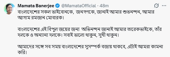 এদিন বিএনপি চেয়ারপার্সনকে শুভেচ্ছা জানানোর পাশাপাশি বাংলাদেশের মানুষকে আগাম রমজান মোবারক জানিয়েছেন বাংলার মুখ্যমন্ত্রী মমতা বন্দ্যোপাধ্যায়। নিজের সোশ্যাল মিডিয়া পেজে তিনি লেখেন, ‘বাংলাদেশের সকল ভাইবোনকে, জনগণকে, জানাই আমার শুভনন্দন, আমার আগাম রমজান মোবারক। বাংলাদেশের এই বিপুল জয়ের জন্য অভিনন্দন জানাই আমার তারেকভাইকে, তাঁর দলকে ও অন্যান্য দলকে। সবাই ভালো থাকুন, সুখী থাকুন। আমাদের সঙ্গে সব সময় বাংলাদেশের সুসম্পর্ক বজায় থাকবে, এটাই আমরা কামনা করি।’