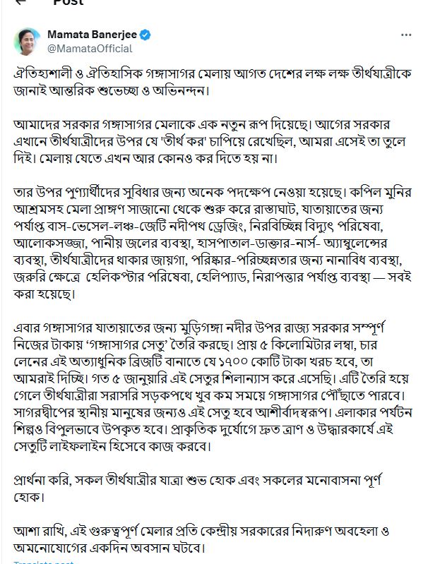 এরপর গঙ্গাসাগর সেতুর প্রসঙ্গ টেনে তিনি লিখেছেন, “এবার গঙ্গাসাগর যাতায়াতের জন্য মুড়িগঙ্গা নদীর উপর রাজ্য সরকার সম্পূর্ণ নিজের টাকায় ‘গঙ্গাসাগর সেতু’ তৈরি করছে। প্রায় ৫ কিলোমিটার লম্বা, চার লেনের এই অত্যাধুনিক ব্রিজটি বানাতে যে ১৭০০ কোটি টাকা খরচ হবে, তা আমরাই দিচ্ছি। গত ৫ জানুয়ারি এই সেতুর শিলান্যাস করে এসেছি। এটি তৈরি হয়ে গেলে তীর্থযাত্রীরা সরাসরি সড়কপথে খুব কম সময়ে গঙ্গাসাগর পৌঁছাতে পারবে। সাগরদ্বীপের স্থানীয় মানুষের জন্যও এই সেতু হবে আশীর্বাদস্বরূপ। এলাকার পর্যটন শিল্পও বিপুলভাবে উপকৃত হবে। প্রাকৃতিক দুর্যোগে দ্রুত ত্রাণ ও উদ্ধারকার্যে এই সেতুটি লাইফলাইন হিসেবে কাজ করবে।” সবশেষে পুণ্যার্থীদের শুভেচ্ছা জানিয়ে একদিন না একদিন এই কেন্দ্রীয় বঞ্চনা যে বন্ধ হবে সেই বিষয়েও আশা প্রকাশ করেছেন মুখ্যমন্ত্রী।