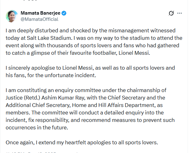 শনিবার সকালে যুবভারতীর ঘটনা নিয়ে এক্স হ্যান্ডেলে দীর্ঘ পোস্ট করেছেন মুখ্যমন্ত্রী। তিনি স্পষ্ট জানান, ‘সল্টলেক স্টেডিয়ামে আজ যে অব্যবস্থা দেখা গেল, তাতে আমি স্তম্ভিত, মর্মাহত। আমি স্টেডিয়ামে যাচ্ছিলাম, অজস্র ক্রীড়াপ্রেমীদের মতোই প্রিয় ফুটবলার মেসিকে দেখতে। এই দুঃখজনক ঘটনার জন্য আমি মেসি এবং সমস্ত ক্রীড়াপ্রেমীদের কাছে ক্ষমাপ্রার্থী।’