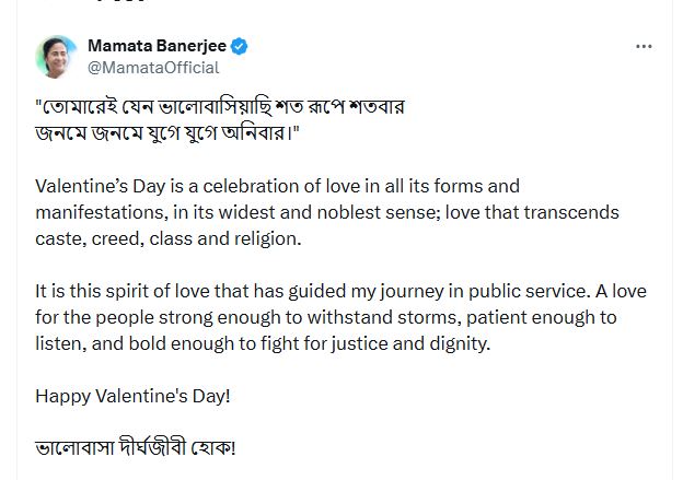 ফেব্রুয়ারি মানেই ভালোবাসার মরশুম। বাঙালির প্রেমদিবস সরস্বতী পুজো হোক বা ইংরেজি মতে ভ্যালেন্টাইন্স ডে- ফাগুয়ার রঙ যেন মর্মে লাগে। শনিবার ভ্যালেন্টাইন্স ডে- প্রেমের সপ্তাহে আজ মহাষ্টমী বলা চলে। শহর থেকে গ্রাম, দেশ থাকে বিদেশ – সর্বত্রই চলছে ভালোবাসা উদযাপনের পালা। সেই উৎসবের আমেজে এবার রাজ্যবাসীকে শুভেচ্ছা জানালেন মুখ্যমন্ত্রী মমতা বন্দ্যোপাধ্যায় (Mamata Banerjee)। নিজের সোশ্যাল মিডিয়ায় কবিতা লিখে প্রেম দিবসের শুভেচ্ছা জানিয়েছেন বাংলার প্রশাসনিক প্রধান। নিত্যদিনের রাজনৈতিক লড়াই ছেড়ে আজ সোশ্যাল মিডিয়ায় যেন এক অচেনা ‘দিদি’র দেখা মিলল।