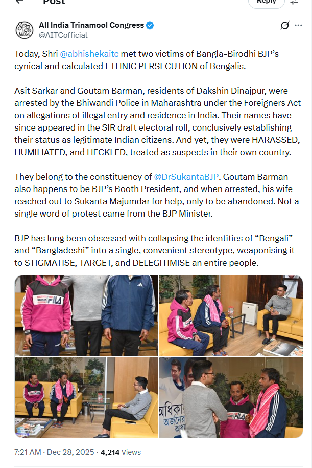 জানা গিয়েছে, মুম্বইতে শ্রমিকের কাজ করতেন বালুরঘাটের বাসিন্দা অসিত সরকার ও গৌতম বর্মন। বাংলা বলে হেনস্তার শিকার হন দুজন। অবৈধ অভিবাসী আইনে তাদের গ্রেপ্তার করে মহারাষ্ট্র পুলিশ। এরপরই গৌতমের স্ত্রী যোগাযোগ করেন সুকান্ত মজুমদারের সঙ্গে। কিন্তু কোন কাজ হয়নি। বিষয়টা জানা মাত্রই পাশে দাঁড়ায় তৃণমূল কংগ্রেস। স্থানীয় বিধায়ক সামিরুল ইসলামের উদ্যোগে ঘরে ফেরেন দুই শ্রমিক।