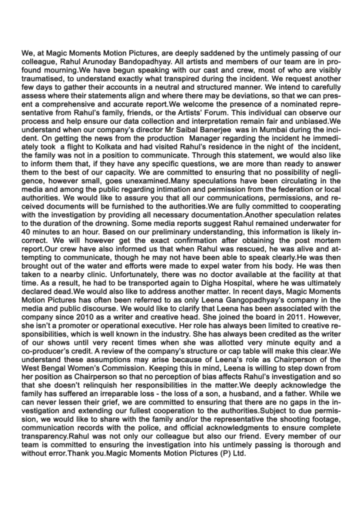 শুটিংয়ের অনুমতি সংক্রান্ত প্রশ্ন নিয়েও মুখ খুলেছে সংস্থা। তাদের দাবি, সমস্ত বৈধ নথি তারা কর্তৃপক্ষের হাতে তুলে দিতে প্রস্তুত এবং কোনও ধরনের গাফিলতি থাকলে তা খতিয়ে দেখতেও বদ্ধপরিকর। ইতিমধ্যে সংস্থার ডিরেক্টর শৈবাল বন্দ্যোপাধ্যায় রাহুলের পরিবারের সঙ্গে দেখা করার চেষ্টা করেছিলেন, তবে ঘটনার দিন পরিস্থিতির কারণে তা সম্ভব হয়নি।