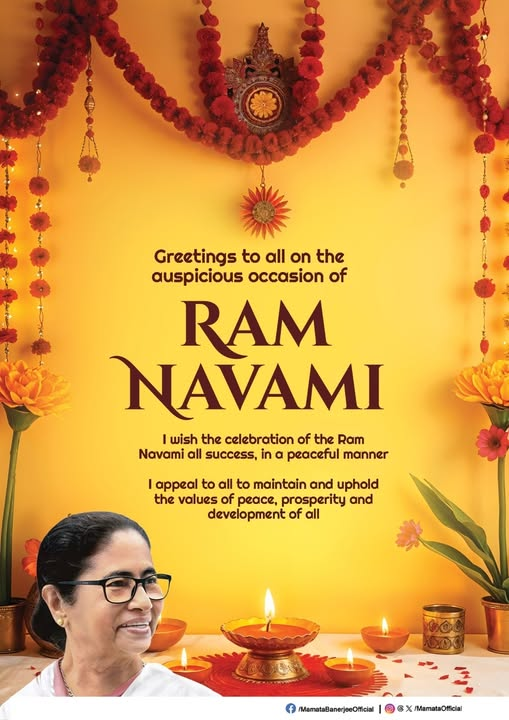রামনবমী উপলক্ষে তিনি লেখেন, ‘এই পবিত্র দিনে সকলের জীবনে সুখ, শান্তি ও সমৃদ্ধি আসুক।’ পাশাপাশি রাজ্যের বিভিন্ন প্রান্তে আয়োজিত শোভাযাত্রা ও ধর্মীয় কর্মসূচিগুলি যাতে নির্বিঘ্ন ও শান্তিপূর্ণভাবে সম্পন্ন হয়, সেই কামনাও করেন তিনি। মমতা বন্দ্যোপাধ্যায় বিশেষভাবে সকলকে সম্প্রীতি বজায় রেখে উৎসব পালন করার বার্তা দেন।