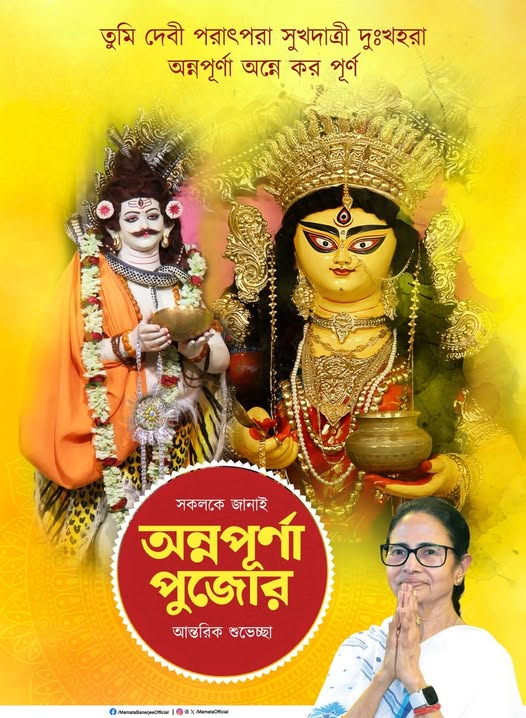 অন্যদিকে, অন্নপূর্ণা পুজো উপলক্ষেও রাজ্যবাসীকে শুভেচ্ছা জানিয়ে দেবী অন্নপূর্ণার প্রতি প্রার্থনা জানিয়ে তিনি সোশ্যাল মিডিয়ায় লেখেন— “তুমি দেবী পরাৎপরা সুখদাত্রী দুঃখহরা, অন্নপূর্ণা অন্নে কর পূর্ণ। সকলকে জানাই অন্নপূর্ণা পুজোর আন্তরিক শুভনন্দন।”