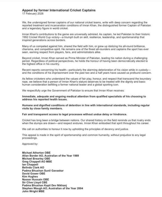 চিঠিতে তাঁরা লিখেছেন, রাজনৈতিক মতাদর্শ যাই হোক না কেন, ইমরান খান একজন কিংবদন্তি ক্রিকেটার ও বিশ্বকাপজয়ী অধিনায়ক। তাই মানবিক দৃষ্টিভঙ্গিতে তাঁর সঙ্গে আচরণ করা উচিত। দ্রুত ও যথাযথ চিকিৎসা, পরিবারের সঙ্গে নিয়মিত সাক্ষাৎ এবং তাঁর স্বাস্থ্যের স্বচ্ছ আপডেট দেওয়ার জন্য পাকিস্তান সরকারের কাছে আবেদন জানিয়েছেন তাঁরা। এখনও পর্যন্ত পাকিস্তান সরকারের তরফে এই চিঠি নিয়ে কোনও আনুষ্ঠানিক প্রতিক্রিয়া মেলেনি।