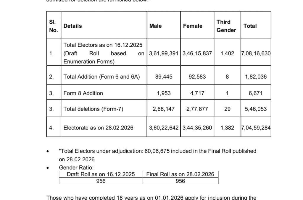 উল্লেখ্য, গত বছর ২৭ অক্টোবর বিশেষ নিবিড় সংশোধনের ঘোষণা করা হয়। তখন রাজ্যে মোট ভোটার ছিলেন ৭ কোটি ৬৬ লক্ষ ৩৭ হাজার ৫২৯। এনুমারেশন পর্বের পর ১৬ ডিসেম্বর প্রকাশিত খসড়া তালিকা থেকে বাদ পড়েছিলেন ৫৮ লক্ষ ২০ হাজার ৮৯৯ জন। সেই খসড়া তালিকায় নাম ছিল ৭ কোটি ৮ লক্ষ ১৬ হাজার ৬৩০ জনের। মনোজ আগরওয়াল জানিয়েছেন, SIR প্রক্রিয়া শুরু হয়ার আগে পুরুষ ও মহিলা ভোটারদের অনুপাত ছিল ১০০০: ৯৫৬। চূড়ান্ত ভোটার তালিকার প্রথম পর্বের পরেও সেই অনুপাত একই আছে।