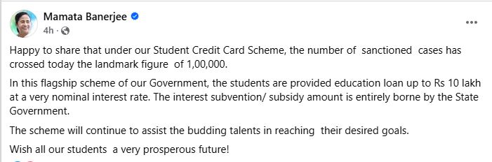 ২০২১ সালের বিধানসভা নির্বাচনে ইস্তেহার প্রকাশ করে তৃণমূল নেত্রী মমতা বন্দ্যোপাধ্যায় জানিয়েছিলেন ছাত্রছাত্রীদের উচ্চশিক্ষার জন্য স্টুডেন্ট ক্রেডিট নামক প্রকল্প শুরু করার বিষয়ে। তৃতীয়বার সরকার গঠনের পরই সেই প্রতিশ্রুতি পালন করেছিলেন রাজ্যের প্রশাসনিক প্রধান। এই প্রকল্পে ছাত্রছাত্রীরা সহজ শর্তে ব্যাঙ্কগুলি থেকে ঋণ পেয়ে থাকেন। যার গ্যারেন্টার সরকার নিজেই। স্টুডেন্ট ক্রেডিট কার্ড থাকলে উচ্চশিক্ষার জন্য ১০ লক্ষ টাকা পর্যন্ত ঋণ পান সমস্ত পড়ুয়ারা। পড়ুয়ারা চাইলে ২ লক্ষ টাকাও থেকে ১০ লক্ষ টাকা পর্যন্ত ঋণ নিতে পারেন। শুধু তাই নয় সুদের একটা বড় অংশও দেয় রাজ্য সরকার। যার ফলে পড়ুয়ারা অনেক কম সুদে ঋণের সুবিধা পায়। এই প্রকল্পের আওতায় সুবিধাভোগী গোষ্ঠী হিসাবে রয়েছে রাজ্যের একটা বড় অংশের পড়ুয়া।