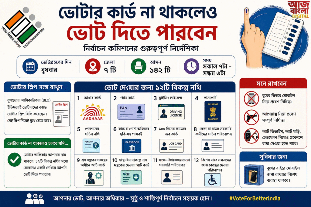 কমিশনের পক্ষ থেকে জানানো হয়েছে, ভোটার তালিকায় নাম থাকলে ভোটার কার্ড সঙ্গে না থাকলেও ভোট দেওয়া যাবে। সে ক্ষেত্রে নির্দিষ্ট ১২টি বিকল্প পরিচয়পত্রের মধ্যে যে কোনও একটি দেখিয়ে ভোটকেন্দ্রে নিজের ভোটাধিকার প্রয়োগ করা সম্ভব। এই বিকল্প নথিগুলির মধ্যে রয়েছে আধার কার্ড, প্যান কার্ড, ড্রাইভিং লাইসেন্স, পাসপোর্ট, পেনশনের সচিত্র নথি, ব্যাঙ্ক বা পোস্ট অফিসের ছবি-সহ পাসবই, ১০০ দিনের কাজের জব কার্ড, সরকারি কর্মীদের সচিত্র পরিচয়পত্র, শ্রম মন্ত্রকের স্মার্ট কার্ড, স্বাস্থ্যবিমা প্রকল্পের স্মার্ট কার্ড, সাংসদ বা বিধায়কদের সরকারি পরিচয়পত্র এবং বিশেষ ভাবে সক্ষমদের জন্য কেন্দ্রের দেওয়া পরিচয়পত্র।